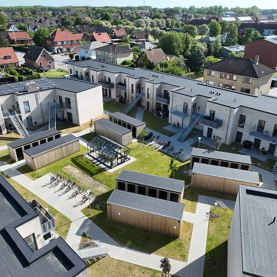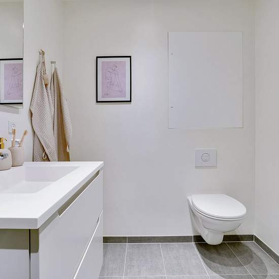 The sizes of the residences range from 56–136 m2, and the layout itself makes them suitable for singles, seniors and small as well as large families. All apartments are laid out with an open kitchen/living area in direct connection with a lovely bright dining space and living room. From the living room on the ground floor there is access to a lovely tiled terrace, while residents on the first floor can enjoy outdoor life on their own balcony. This 56 m2 residence consists of an entrance hall with space for outerwear. From here you are led in...