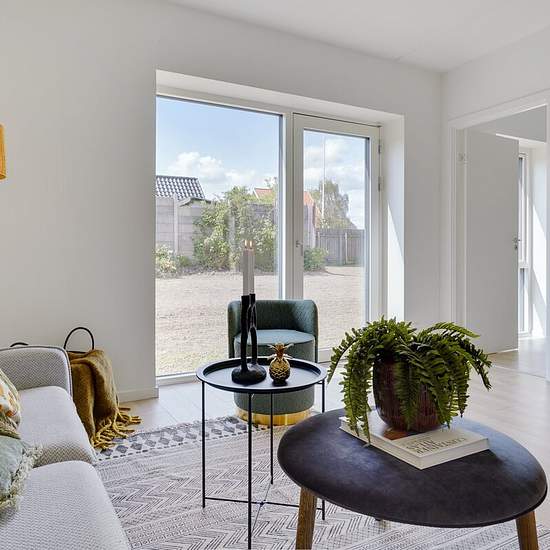 The sizes of the homes range from 56–136 m2, and the layout itself makes them suitable for singles, seniors, and both small and large families. All apartments are arranged with an open-plan kitchen/dining area in direct connection with a lovely bright dining space and living room. From the living room on the ground floor there is access to a lovely tiled terrace, while residents on the first floor can enjoy outdoor life on their own balcony. This 56 m2 home consists of a small entrance hall, where you also find the apartment's bathroom. Here...