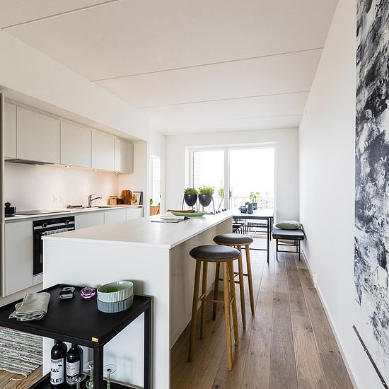 The apartment is a spacious 4-room residence with a functional and well-thought-out layout, where living areas and private rooms are naturally separated. You enter the apartment through an entrance hall, which leads to a hallway with storage space. From the hallway, the apartment opens up to a large, bright living area where the kitchen, dining area, and living room are integrated into one cohesive space. The kitchen is placed along the wall and designed with good working conditions as well as a kitchen island that creates a natural transiti...