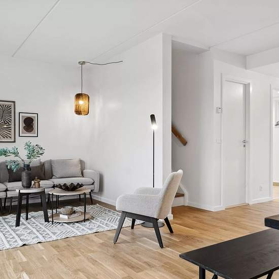 Welcome to this lovely home of 106 m² spread over two levels. On the ground floor you are greeted by a spacious entrance hall with plenty of room for shoes and outerwear. From here there is access to a sleek kitchen open to the living room — a bright and inviting living area with space for both a dining area and a cozy sitting area where the family can gather. From the living room there is direct access to a terrace/garden that invites relaxation and pleasant moments outdoors. The home has two toilets — a guest toilet on the ground floor n...